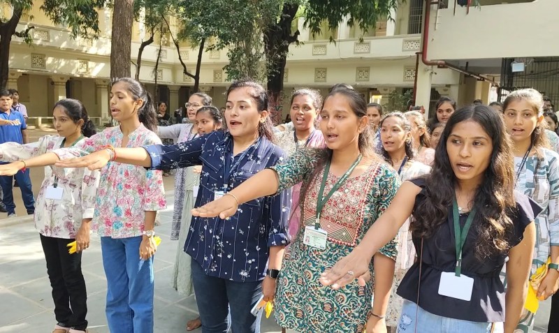 कॉलेज के छात्रों ने ना व्हाट्सएप वापरूं, ना फेसबुक वापरूं, मां-बाप के सपने पूरे करने हैं, मुझे मोबाइल का उपवास करना है, ना चैटिंग करूं, ना सेटिंग करूं, मां-बाप के सपने पूरे करने हैं, मुझे मोबाइल का उपवास करना है गरबा गीत गाया।