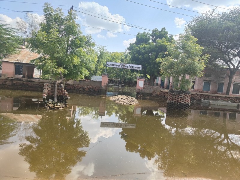 सुजानगढ़. पशुओं की चिकित्सा को लेकर संचालित ए श्रेणी पशु चिकित्सालय खुद बीमार व खस्ता हालत में है जिसे लेकर न केवल पशुपालन विभाग के उच्च अधिकारी लापरवाह व उदासीन है तभी शहर के एकमात्र राजकीय चिकित्सालय के अंदर व बाहर 23 दिनों के बाद भी बरसाती पानी जमा है। पशुपालक दर-दर भटकने को मजबूर है। चिकित्सालय में पानी भर जाने के बाद चिकित्साकर्मियों का कोई ठोर- ठिकाना नहीं है।