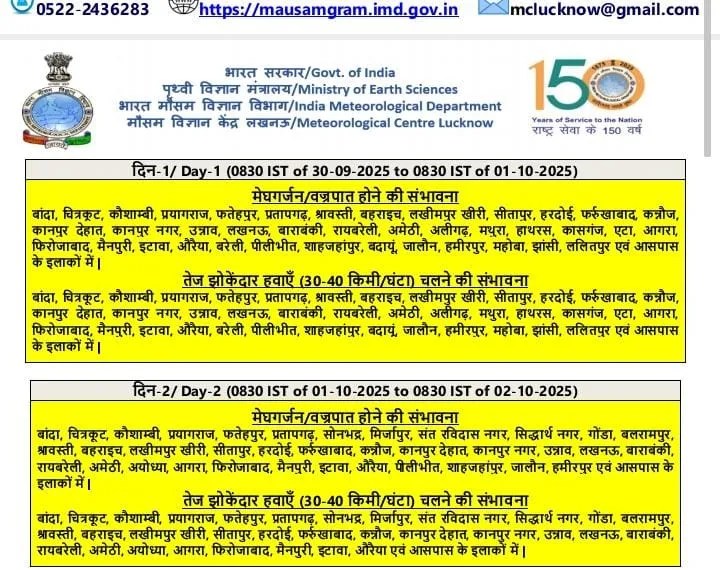 मौसम विभाग ने प्रदेश के कई हिस्सों में बिजली गिरने और गरज-चमक के साथ बारिश की चेतावनी दी है। गोंडा, बलरामपुर, श्रावस्ती, बहराइच, लखीमपुर खीरी, सीतापुर, हरदोई, बांदा, चित्रकूट, कौशांबी, प्रयागराज, फतेहपुर, प्रतापगढ़, सोनभद्र, मिर्जापुर, भदोही, सिद्धार्थनगर, फर्रुखाबाद, कन्नौज, कानपुर नगर, कानपुर देहात, उन्नाव, लखनऊ, बाराबंकी, रायबरेली, अमेठी, अयोध्या, आगरा, फिरोजाबाद, मैनपुरी, इटावा, औरैया, पीलीभीत, शाहजहांपुर, जालौन और हमीरपुर समेत आसपास के इलाकों के लिए मौसम विभाग ने येलो अलर्ट घोषित किया है।