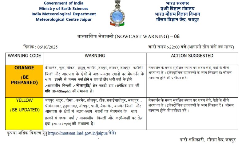 मौसम विभाग ने छह अक्टूबर को पूर्व में ही तेज बारिश का अलर्ट जारी किया था। राज्य में आज अधिकतम तापमान फलोदी में 35 डिग्री दर्ज किया गया।