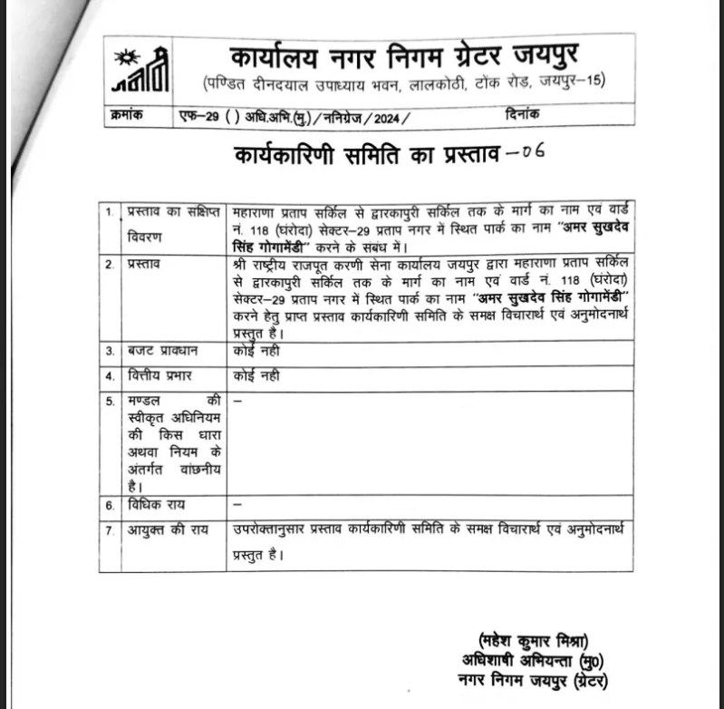 सबसे ज्यादा विवाद प्रस्ताव नंबर 6 को लेकर हुआ, जिसमें महाराणा प्रताप सर्किल से द्वारकापुरी सर्किल तक के मार्ग और वार्ड 118 (घंरोदा) सेक्टर-29, प्रतापनगर स्थित पार्क का नाम सुखदेव सिंह गोगामेड़ी के नाम पर रखने की मंजूरी मांगी गई थी। यह प्रस्ताव श्री राष्ट्रीय राजपूत करणी सेना की ओर से भेजा गया था, जिसे मेयर सौम्या गुर्जर ने बैठक के एजेंडे में शामिल किया। सुखदेव सिंह गोगामेड़ी श्री राष्ट्रीय राजपूत करणी सेना के संस्थापक थे।