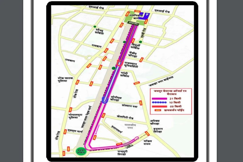 जयपुर। भारतीय सेना की दक्षिण-पश्चिमी कमान द्वारा आयोजित प्रतिष्ठित जयपुर वेटरंस ऑनर्स रन मैराथन रविवार सुबह आयोजित की जाएगी। हर वर्ष की तरह इस बार भी विभिन्न श्रेणियों की दौड़ में बड़ी संख्या में प्रतिभागी हिस्सा लेंगे। मैराथन के निर्बाध संचालन और शहर में ट्रैफिक जाम से बचाव के लिए यातायात पुलिस ने विशेष रूट प्लान जारी कर तैयारियां पूरी कर ली हैं।