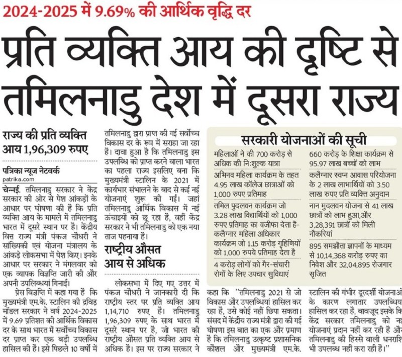 प्रेस विज्ञप्ति में कहा गया है कि मुयमंत्री एम.के. स्टालिन की द्रविड़ मॉडल सरकार ने वर्ष 2024-2025 में 9.69 प्रतिशत की आर्थिक विकास दर के साथ भारत में सर्वोच्च विकास दर प्राप्त कर एक बड़ी उपलब्धि हासिल की है। इसे पिछले 10 वर्षों में तमिलनाडु द्वारा प्राप्त की गई सर्वोच्च विकास दर के रूप में सराहा जा रहा है। दावा हुआ है कि तमिलनाडु इस उपलब्धि को प्राप्त करने वाला भारत का पहला राज्य इसलिए बना कि मुयमंत्री स्टालिन के 2021 में कार्यभार संभालने के बाद से कई नई योजनाएं शुरू की गईं। जहां तमिलनाडु आर्थिक विकास में नई ऊंचाइयों को छू रहा है, वहीं केंद्र सरकार ने भी तमिलनाडु को एक नया ताज पहनाया है।