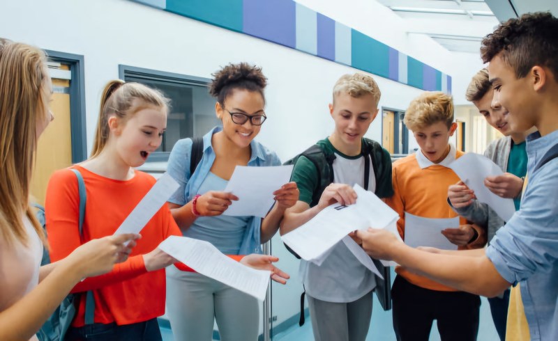 Happy students have received their exam results in high school. They are cheering and celebrating.